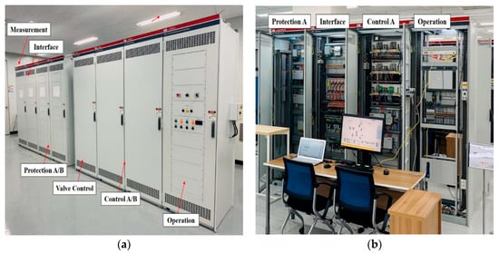 TCSC replica controller is 100% identically designed, manufactured, and operated together with RTDS except for the duplication of the on-site controller and the control and protection system. In conjunction with RTDS, pre-commissioning was performed on more than 100 test items before the on-site testing of the on-site controllers. It is used for reproducibility and causes an analysis of problems occurring in the field, analysis of the interaction with nearby facilities, and a verification before updating the on-site controllers. Figure 5a shows the TCSC field controller installed in the SYJ substation, and Figure 5b shows the replica controller installed in the laboratory [19,20,21,22,23].