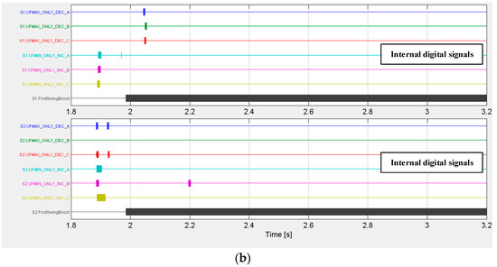 Instantaneous output increase control performance test results in case of 765 kV failure. (a) Boost factor in case of 765 kV failure, before relocation (top)/after relocation (bottom). (b) 765 kV failure TCSC internal control digital signal, before relocation (top)/after relocation (bottom).