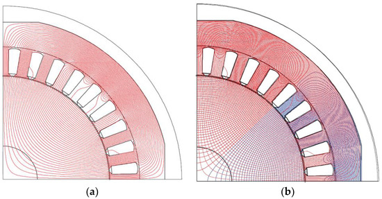 Flux lines of a solid rotor of a SynRM: (a) d−axis; (b) d− and q−axes.