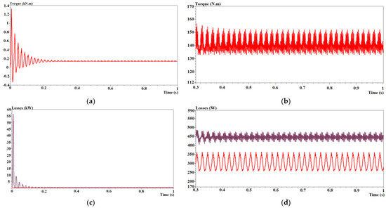 Figure 5 illustrates that values of both Te and Pcop reach to approximately 9 times their steady-state values since stator current of machine is very high during the startup and both the output torque and copper loss depend on this current. The average values of Te and Trip obtained both from the 0.8 s and 1 s time interval of the fine-tuned SynRM are 140.8 N·m and 13.72%, respectively, and demonstrated in Figure 5a,b. Additionally, changes of Pcop and Pfe of the fine-tuned machine in the given range are shown in Figure 5c,d. The average values of Pfe and Pcop are 300.6 W and 445.4 W, respectively. Besides, Ptotal is obtained as 1131 W by addition of Pother, 385 W obtained from analysis results of existed IM. Moreover, ξ and cosΦ of the fine-tuned SynRM are obtained as 9.0599 and 0.774, respectively.
