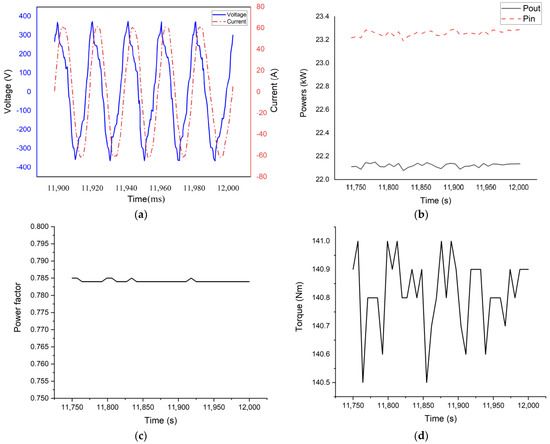Test results: (a) Current and Voltage of Phase A; (b) Input and output powers; (c) Power factor of the machine; (d) Output torque; (e) Efficiencies; (f) Temperature of the machine.