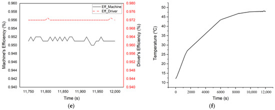 The efficiency values of the manufactured machine, and the driver are demonstrated in Figure 8e. The η of the machine alters in between 95% and 95.2% seen in the figure. Moreover, η of the machine is obtained as 95.2% at 11,757.8 s. It should be depicted that this η value is within the range of IE5 efficiency class considering the experimental tolerance defined by IEC.