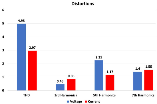 The 3rd, 5th, and 7th harmonics of line voltages and phase currents are the most effective harmonics seen in the machine, and the average values of them are shown as histograms with blue and red bars, respectively, in Figure 9. In addition to these harmonics, the average values of total harmonic distortions, THD, of line voltages and phase currents obtained are demonstrated on the left side of the figure.