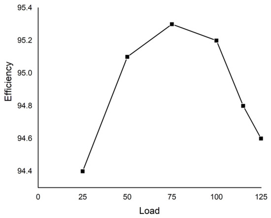 The figure demonstrates that the efficiency of the generated SynRM at full load is 95.2%, the machine reaches its most efficient value, i.e., 95.3%, at 75% load value. The machine’s efficiency at 25% and 125% load are 94.4% and 94.6%, respectively.