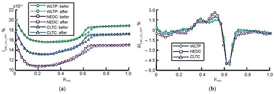 Figure 9. Test results for three driving cycles before optimization after optimization: (a) for good tire grip, (b) for low tire grip.
