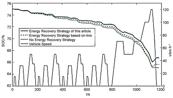In [40], the authors developed a strategy for distributing the braking force. The ECE control curves and the ideal brake force distribution curves were taken as the basis for developing the strategy. The strategy was tested for the European driving cycle. The results showed that the braking stability required by the requirement is provided by the developed algorithm (Figure 11). If the state of charge is taken at 75% as the starting point, then, according to the simulation results, after moving to the European cycle according to the strategy of this article, the charge decreases by 8.22%. A similar movement according to the standard strategy causes a decrease in charge by 9.12%. Thus, if the estimated battery usage target is 95–5%, then the total range of the EV can be increased by up to 136 km. This shows the viability of the strategy proposed by the authors of [40].