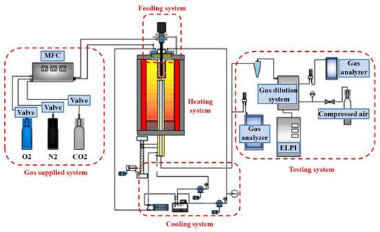 The experimental set up employed the fixed combustion particle dilution sampling system developed by Tsinghua University. PM samples were simultaneously sampled from the collected ash and classified for analysis [27]. To study the morphology and composition, a poly-ammonia carbonate membrane was used for imaging and electron microscope analysis [28]. An electrical low-pressure impactor (ELPI) (97 2E, NO.24423, Dekati Ltd., Kangasala, Finland) was used to measure the ash particle size distribution. The particle morphology and composition were analyzed using a combined scanning electron microscopy–energy dispersive X-ray spectroscopy approach (SEM–EDX; EVO18).