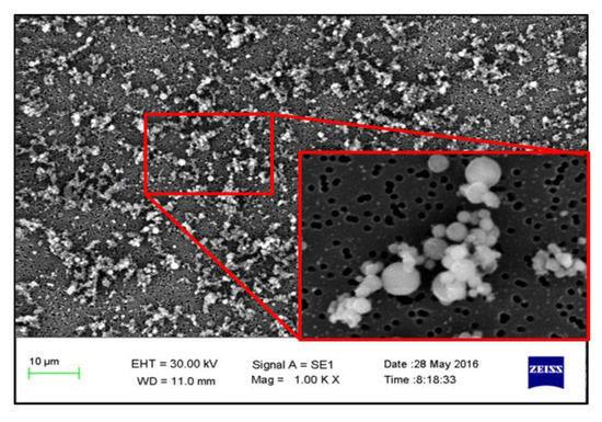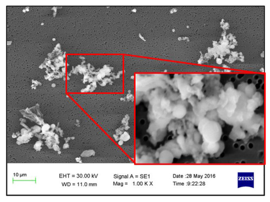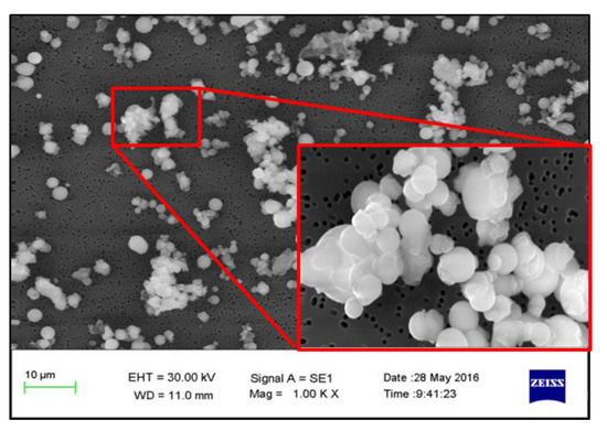 Morphologies of the particulate matter generated by the combustion of raw coal and raw coal-carrying Mg are shown in Figure 2 and Figure 3, respectively. Compared with raw coal combustion, the particulates generated by the combustion of raw coal-carrying Mg shows accumulation state [29], and it is evident that a part of the submicron particles adhered to the surface of the coarse-mode particles, which makes the particle size generally increase. Yoshihiko [30] observed the coal-carrying magnesium-based compounds by scanning electron microscopy, and it showed that magnesium-based compounds uniformly dispersed in the coal surface, the average particle size was among the sub-micron level, the magnesium-based additive is an intrinsic mineral element in coal and not an external mineral in physically mixed form (this extraneous mineral and coal particles have relatively few connections). Therefore, it can be considered that the loaded magnesium element exists mainly in the form of an intrinsic mineral [31,32,33].