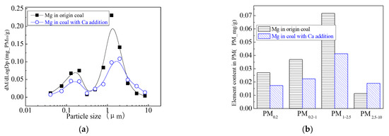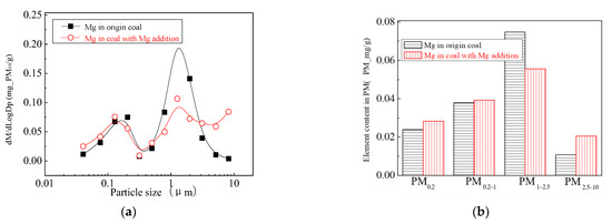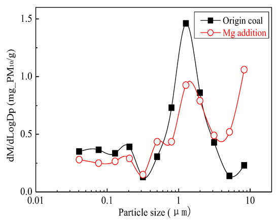 Figure 4 is the generating particulate matter mass size distribution by the original coal and the original coal with the addition of Mg. It can be seen that the addition of Mg element shows the changes in particle size. Primitive minerals (including particle size and chemical composition) to some extent affect the effect of adding Mg minerals. Figure 5 shows the amounts of PM0.2, PM0.2–1, PM1–2.5 generated from raw coal and Mg-carrying raw coal. The production of PM0.2, PM0.2–1, PM1–2.5 were reduced from 0.32 mg/g, 0.31 mg/g, 0.45 mg/g to 0.25 mg/g, 0.26 mg/g and 0.34 mg/g, respectively. After adding Mg, the amount of PM0.2, PM0.2–1, PM1–2.5 decreased by 36.7%, 17.4% and 24.6%, respectively, and the amount of PM2.5 was reduced by 21.6%. While the PM2.5–10 production increased from 0.17 mg/g to 0.41 mg/g. The total mass of PM10 was 1.24 mg/g and 1.26 mg/g, almost no changes at all. It is clear that the chemical composition of PM10 has changed.