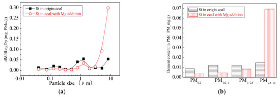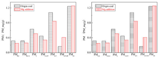 - The amount of PM0.2, PM0.2–1 and PM1–2.5 produced by the raw coal-carrying Mg are reduced by 36.7%, 17.4% and 24.6%, respectively, and the amount of PM2.5 is reduced by 21.6%. The amount of PM10 is almost unchanged. Adding Mg can effectively increase the viscosity of submicron particles, making it easier to aggregate and bond together to form ultra-micron particles.