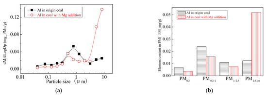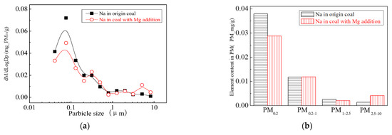 The main elemental compositions of the particulates generated by the combustion of pulverized coal-carrying Mg are Fe, Mg, Ca, Al and Si, and the main volatile elements is Na, which are shown in Figure 6, Figure 7, Figure 8, Figure 9, Figure 10 and Figure 11. The decrease in PM1 is mainly due to the decrease in Fe, Ca, Al and Si, and the reduction of volatile elements also play a certain role. The reduction of PM1–2.5 is mainly due to the reduction of the insoluble Al, Si and Fe elements, and the reduction of volatile elements is little, which is almost negligible [34]. The Al, Si and Fe elements in part of the particles below 1 µm transformed coarse mode particles above 2.5 µm, which is the main reason for the decrease in PM 2.5 generation [35,36]. According to the analysis of particle composition under different particle sizes, the results show that the main reason for the decrease in PM1 is the transfer of Ca, Mg, Al and Si from submicron particles to ultra-micrometer particles.