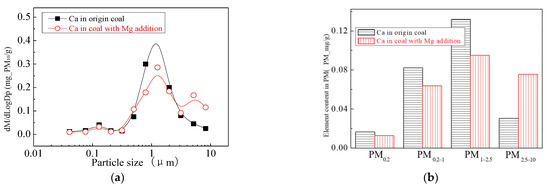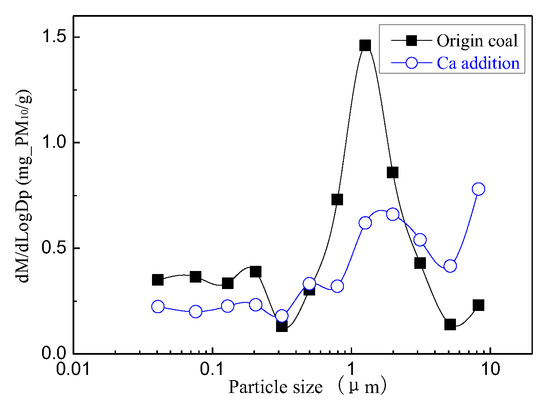 Figure 14 and Figure 15 are the particulate matter mass size distributions for the particles generated by raw coal and raw coal with Ca-based addition [43]. From the figures, we can see the particle size changes after adding the Ca element. Raw minerals (including particle size and chemical composition) to some extent affect the effect of adding Ca minerals by comparing the effects of Ca minerals addition on the production of PM0.2, PM0.2–1 and PM1–2.5.The production of PM0.2, PM0.2–1 and PM1–2.5 were reduced from 0.32 mg/g, 0.31 mg/g, 0.45 mg/g to 0.20 mg/g, 0.21 mg/g, 0.26 mg/g, respectively. After adding Ca, the amount of PM0.2, PM0.2–1 and PM1–2.5 decreased by 36.3%, 33.0% and 42.8%, and the total amount of PM2.5 was reduced by 38%. While the PM2.5–10 production increased from 0.17 mg/g to 0.35 mg/g. The production of PM10 generated by raw coal was 1.24 mg/g and 1.02 mg/g after the raw coal-carrying Ca, a decrease of 17.7%. The effect of adding Ca compounds on the particles is better than that of Mg.