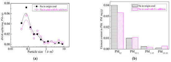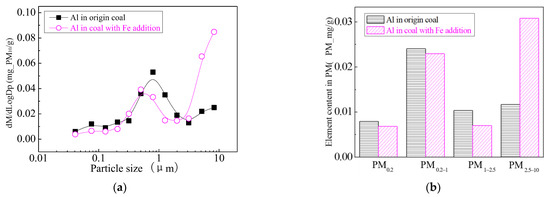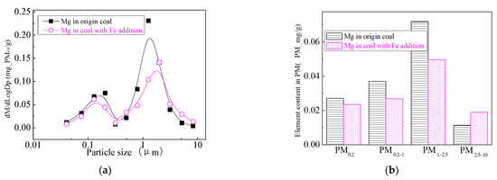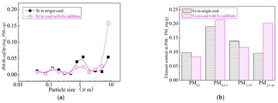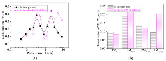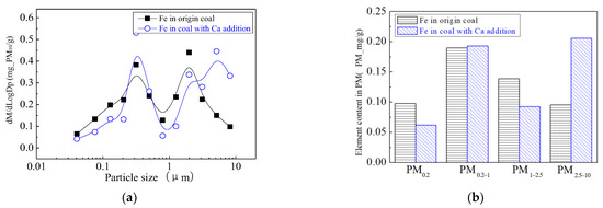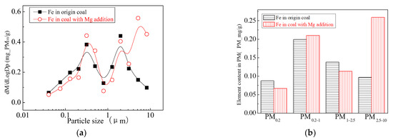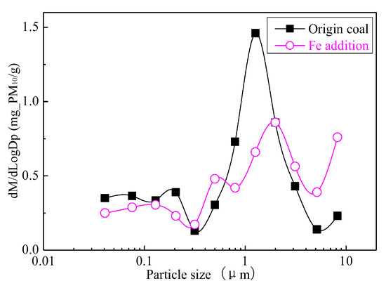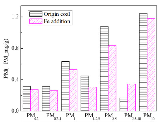 Figure 24 shows the particle size distribution of the particles by combustion of raw coal and raw coal-carrying Fe. It can be seen that, after adding Fe element, the mass particle size of the generated particle changes. Raw minerals (including particle size and chemical composition) affect the effect of adding Fe minerals to some extent [53]. As shown in Figure 25, by comparing the effects of raw coal and raw coal adding Fe on the formation of PM0.2, PM0.2–1 and PM1–2.5; the production of PM0.2, PM0.2–1 and PM1–2.5 were reduced from 0.32 mg/g, 0.31 mg/g, 0.45 mg/g to 0.27 mg/g, 0.26 mg/g and 0.31 mg/g. After adding Fe, the production of PM0.2, PM0.2–1 and PM1–2.5 decreased by 15.6%, 16.2% and 31.1%, respectively, and the production of PM2.5 was reduced by 22.4%. While the production of PM2.5–10 increased from 0.17 mg/g to 0.34 mg/g, the production of PM10 was reduced from 1.24 m/g to 1.18 mg/g. It is clear that a significant fraction of the submicron particles produced during coal combustion are converted into ultra-micron particles after the addition of Fe minerals.