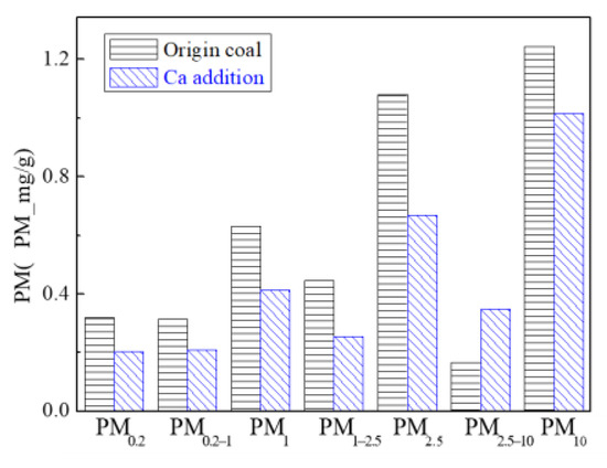 - The amount of PM0.2, PM0.2–1 and PM1–2.5 produced by the raw coal-carrying Ca are reduced by 36.3%, 33.0% and 42.8%, respectively, and the amount of PM2.5 is reduced by 38%. The production of PM10 is reduced by 17.7%. The effect of adding Ca compounds on the particles is better than that of Mg.