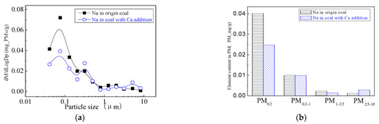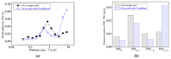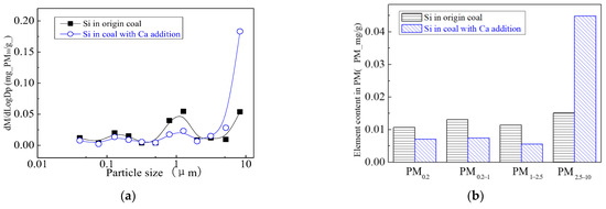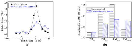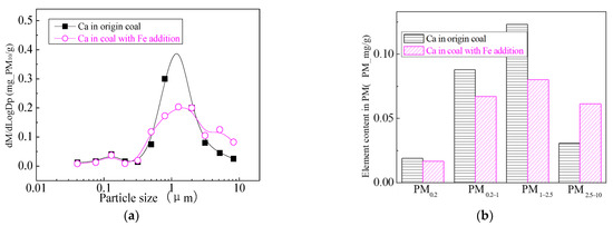 By adding calcium in the coal minerals, the content of the calcium improves the proportion of liquid components, improving the surface adhesion of mineral elements Al, Si, Fe and others on the big particles during the combustion process, which makes submicron particles transform to PM1+, and aggregated to form large particles of Ca-Fe-Al-Si and Ca-Al-Si components by collision. By changing the composition of ash, the ash melting point can be reduced, which makes PM2.5 accumulate into bigger particles, increasing the production of PM2.5+ and reducing PM2.5 emissions [52].