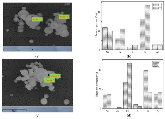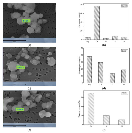 The addition of Mg-based compounds can significantly affect the mineral conversion during pulverized coal combustion. The morphology of the particle and energy spectrum are shown in Figure 12. The SEM results show that the spherical particles indicate that they are formed by droplets in the combustion process; semi-molten irregular particles show that they are from the transition of the solid or incomplete liquid particles. The forming liquid material may provide a viscosity that allows the submicron particles or fine particles to adhere to the coarse mode particles, which allows the conversion of these elements to particles of different particle sizes. The fine particle morphology indicates that they are formed by the accumulation of small particles, the increase in the mass percentage of the liquid material is the primary reason for the formation of suitable viscosities [37], the submicron particles adhere to the coarse mode particles and they can capture submicron particles which can reduce the amount of sub-micron particulate matter. From the three points of the first figure, the Mg content is the highest at point 1 which can reach 87%, the Mg content at point 2 is 30%, and the Mg content at point 3 is 33%. Mg-Ca-Fe-Al-Si, Mg-Ca-Al-Si and Mg-Al-Si are the main components of the magnesium-containing particles [38].