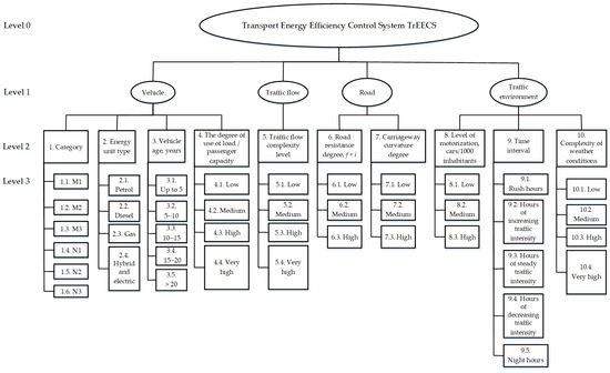 This study is a continuation of the work [28] in which the functional elements of the intelligent transport energy efficiency management system (TrEECS) were identified on the basis of morphological analysis. The structure of the system is presented in Figure 1.