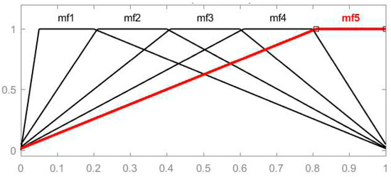 Based on the fuzzy logic models of Mamdani and Sugeno, two versions of the control unit were developed. The terms of the input parameters are given by trapezoidal membership functions. Model variants differ in the form of presentation of the area of the definition of the resulting parameter, presentation of the inference rules, and defuzzification algorithms. In Mamdani’s model, the membership functions of the LEE value ranges are used (Table 4). The type and parameters of the membership functions were experimentally selected. The Sugeno model uses an array of LEE values in the training sample. The view of the membership functions of the resulting parameter terms in the Mamdani model is shown in Figure 3.