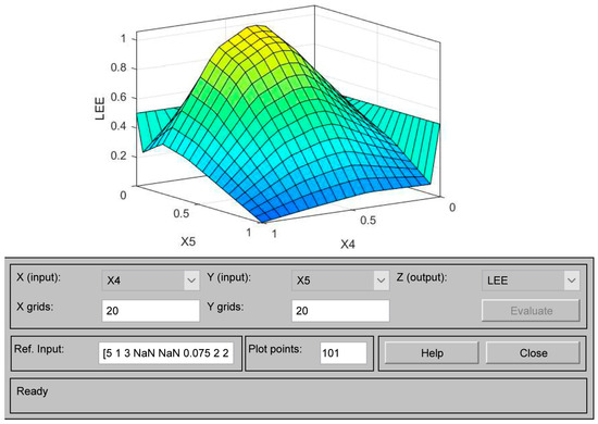 Analysis of the joint influence of the input parameters of the system on the indicator LEE was performed using a graphical method. At the same time, it is convenient to use the Sugeno model, which also showed a high accuracy of the model values of the energy efficiency level. According to the results of the previous study, it can be stated that the most significant factor in evaluating vehicle energy efficiency is the parameter x4 − the degree of use of load/passenger capacity. Therefore, it is advisable to study the dynamics of the influence of combinations of the specified parameters and parameters of various functional elements of the system on the level of vehicle energy efficiency. Figure 4 shows the influence of the degree of use of load capacity of cars and the complexity of the traffic flow on the indicator LEE.