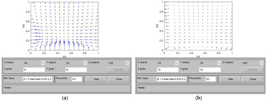 The dependence of LEE(x4,x5) is non-linear. Figure 5 shows the projection of LEE(x4,x5) onto the x4 × x5 plane for buses (a) and trucks (b). The arrows in Figure 5 (gradient) point to the point () where the maximum value of LEE energy efficiency is reached. The maximum value of LEE(x4,x5) is reached within the average level of its arguments (see Table 2): and regardless of the vehicle category (Figure 5).