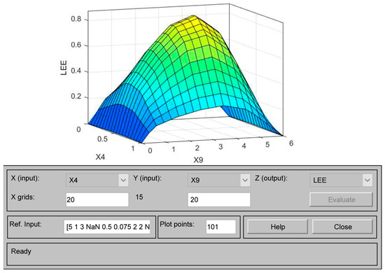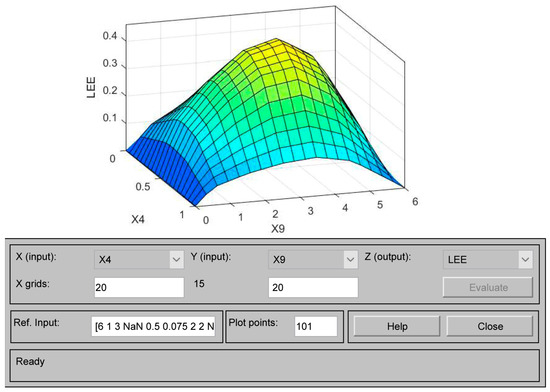 The described trends regarding the dependence gradient LEE(x4,xj), 1 ≤ j ≤ 9, are preserved for other combinations of x4 with the parameters of the functional elements of the transport system. Thus, the decrease in the LEE(x4,x9) gradient reflects a decrease in the level of energy efficiency when the parameter x1 = 5 (category N2) is changed to the value x1 = 6 (category N3), provided that other parameters are the same (Figure 6 and Figure 7).