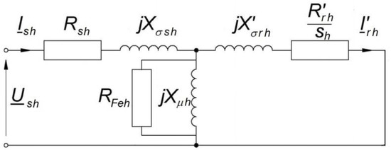 where: Rrh’—rotor cage resistance for harmonic h ≥ 5, Irh’—RMS value of the harmonic h of the equivalent rotor current, Rkh—measured short-circuit resistance of the motor for the frequency of h ∙ f1, Ikh—RMS value of the measuring short-circuits phase current of the motor with a frequency of h ∙ f1, Ukh—RMS value of the measuring short-circuits phase voltage of the motor with a frequency of h ∙ f1, Pkh—measured motor short-circuit power at a frequency of h ∙ f1, Ush—RMS value of the harmonic h of the phase motor supply voltage.
