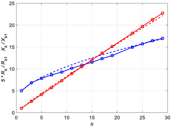 Approximation Formulas (21) and (22) (Figure 2) were selected based on experiments presented in papers [5,6,7,10], where power relations of resistance and reactance to frequency were assumed. However, the formula for the short-circuit resistance was extended so that: (a) there is no passus of zero short-circuit resistance of the machine for direct current, (b) there is possible correctly reproduce by the approximation formula the sum of the stator resistance Rsh for the frequency of the rated slip (h = sN) and the rotor resistance RrN’. The resistance RrN’ is implicitly present in the Formula (6) and the rated power losses in the rotor (18) depend on it, which is of key importance for determining the admissible torque and power. The coefficients a, x were calculated in such a way that the calculated short-circuit active powers for all frequencies (all h orders) were not smaller than the measured short-circuit active powers. In [22], the powers of y obtained from the approximation for various motors were always in the range from 0.9 to 1.1, so the increase in the reactance value with frequency was always approximately linear.