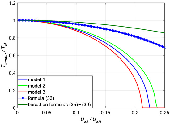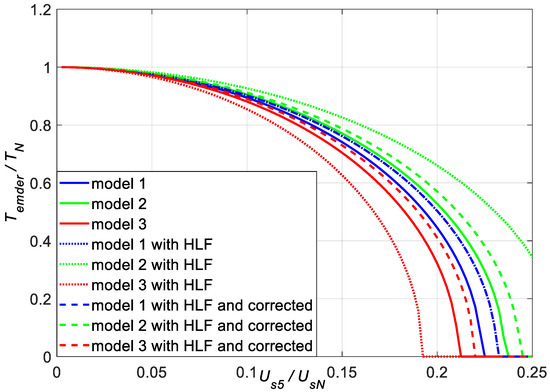 Figure 7 shows the admissible motor load torques according to (4), which are shown in Figure 4, and the admissible motor load torques according to (52), (54), (56). These were calculated in two variants: exactly according to these formulas and by replacing the approximation expressions present in the coefficient C before HLF2 according to (53), (55), (57) with the resistance ratio RrN’/Rr1′. This substitution approximates the curves according to (54) and (56) to the curves according to (4). For the curve according to (52), this substitution does not cause any changes, according to identity (53). There are significant differences between the curves according to (4) and the curves drawn with dashed lines. For example, for us5 = 0.2 these differences are: for the curve according to (52) 0.06TN, for the curve according to (54) 0.042TN and for the curve according to (56) 0.09TN. These differences increase with a decrease in the admissible motor load torque. They result from the use of the measured values of short-circuit powers and resistances (Pkh, Rkh) for calculations according to (4), and the approximated values of these powers and resistances for the curves drawn with solid and dashed lines. Admissible torque calculated with HLF is always overestimated in relation to its value based on (4). Paradoxically, this results from the choice of the coefficients a, x of the approximation of increase in the short-circuit resistance of the motor with the frequency of the short-circuit current, so that the calculated short-circuit active power is never smaller than that measured for each frequency. This approximation formula is in the denominator of each HLF expression (Formulas (44), (47), (49)), which underestimates its value and increases the admissible motor load torque according to (52), (54), (56).