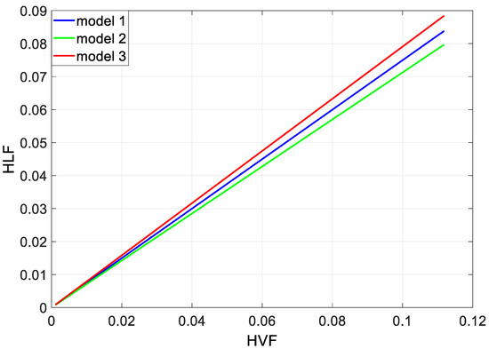 For the tested motor, for all three models, the HLF values as a function of the HVF values are shown in Figure 6, to show differences in HLF and HVF values for the same Us5 values.