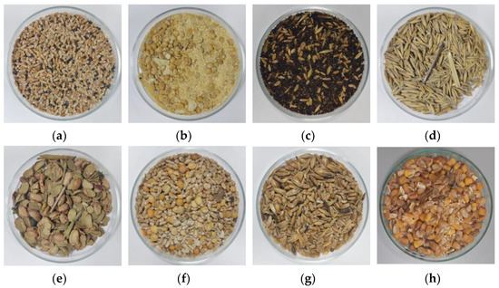 Seed production wastes (SPW) of eight major agricultural crops (wheat, soybean, rapeseed, oat, bean, peas, barley, and corn) (Figure 1) in Croatia were collected from the University of Zagreb Faculty of Agriculture, Experiment station Šašinovec (45° 856,202 N, 16° 174,306 E). Experiment station Šašinovec represents the academic and industrial research, development, and production center for seed refinement and production in Croatia. As the experiment station uses machines and equipment representative for the relevant seed producers in Croatia, using data on the total production, yield, and share of waste of an individual crop, the total availability of individual SPW was calculated. Individual SPW was used in further steps for its energy characterization in the Agricultural Biomass Research Laboratory at the University of Zagreb Faculty of Agriculture.