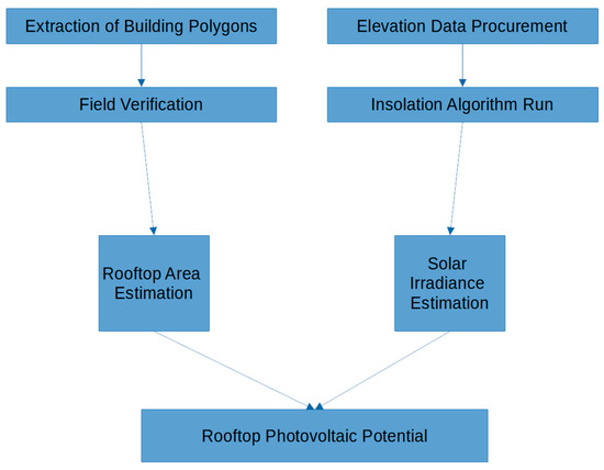 The estimation of RPV potential involves two major steps: estimating the rooftop area (for RPV) of the city in concern and determining the solar insolation on the study area. To this end, several studies have proposed and utilized different methods to calculate RPV potential. In their study, Boz et al. demonstrated an automated ArcGIS model that used LiDAR (Light Detection and Ranging) data to undertake an assessment of RPV systems in the city of Philadelphia [12]. Similarly, Kodysh et al. used LiDAR data and radiation maps obtained from a hemispherical view-shed algorithm to estimate solar radiation on multiple buildings in Knox County, Tennessee [13]. They concluded that their method worked effectively to obtain building rooftop solar radiation maps and argue their method was more accurate than using regional irradiation averages.