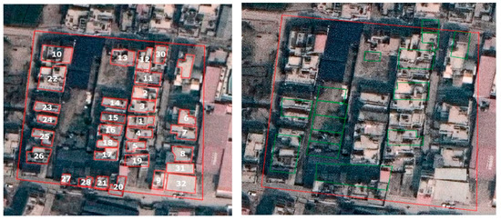 Manual digitization with house numbers (right), OSM polygon extraction (left) (Satellite Imagery of the study area from Google EarthTM).