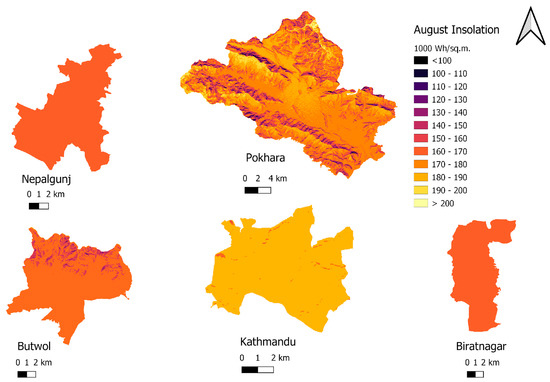 Having ascertained the roof area in each of the five cities, it was possible to then determine the technical generation potential based on the daily irradiation for each month. Figure 5 provides an insight into the role that topology plays in the radiation received at various locations within the five cities studied. Nepalgunj and Biratnagar exhibit a uniform insolation profile due to their relative flatness. However, Butwal experiences slightly more variation due to the terrain in its northern extent and Pokhara demonstrates the most variability due to its numerous hills.
