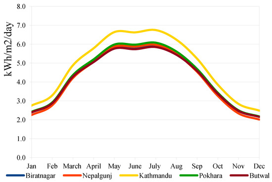 The daily average insolation of the studied cities is shown in Figure 6. It indicates that Kathmandu has the highest insolation throughout the year, whereas other four cities have nearly the same daily average insolation.