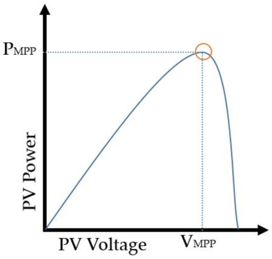 The output voltage of a PV may need to be regulated not only according to end-user values but also to seek the maximum power point (MPP) at which the system can work appropriately at its best efficiency (this can be seen in Figure 1). This role can be performed by using a power converter, the topology of which depends on if the user requires a higher or lower voltage from the PV panel. When a low voltage is necessary, a buck converter is an option, and in the case of a high value, a boost converter is another alternative [13,14,15]; additionally, if both options are required, a buck–boost converter is available as well [16]. Hence, these devices can be configured for maximum power point tracking (MPPT) of a PV system to achieve the best overall efficiency. The main tools for this task are the designed algorithms that can help the system to work at MPP [17,18].