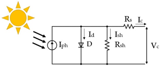 A single-diode model was used for the study because it is simple and accurate. This theory implies treating the PV as a DC source from an electric circuit, as shown in Figure 2. The PV produces a current generated by solar irradiation. In addition, two resistances are modelled, where is related to the diode’s current leakage at the p-n interface; represents the resistance athwart the PV. The latter causes a detrimental phenomenon on the maximum power of the system.