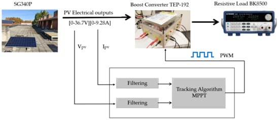 Linked to the PV panel, a TEP-192 boost converter was used. This device allows a voltage increment, and it regulates the output voltage for any usage. It also provides measurements of input–output current and voltage for monitoring. Through the implementation of a metal–oxide–semiconductor field-effect transistor (MOSFET), an input PWM signal can control this boost converter. Further technical details are specified in Table 2.