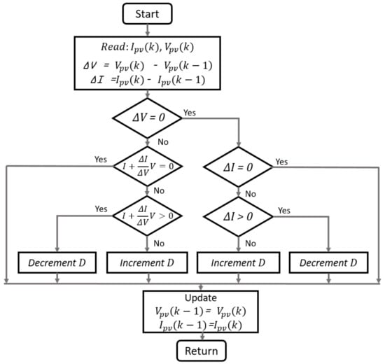 The IncCond tracking algorithm is one of the most widely used techniques due to its simplicity and its high accuracy when compared to the well-known P&O [33,36,37]. It controls the duty cycle, D, of the power converter by evaluating the state of voltage and current and applying increment/decrement changes, as presented in Figure 4. This technique was designed and implemented experimentally by the authors of [38], where they used a slightly regulated step size. A duty cycle with a small step-size value contributes to soft power oscillations at a steady state, but it also leads to a slow dynamic response with sensitivity against external disturbances. An opposite scenario occurs when a larger step size is applied, which leads to excessive power oscillation at a steady state. Therefore, although the obtained results from [38] showed a suitable performance in terms of tracking accuracy, the algorithm was not tested against external disturbance, which makes the performance questionable. Actually, without a variable step-size value, which is the case of most conventional MPPT algorithms, both fast dynamics and steady-state accuracy cannot be attained simultaneously because a variable step size performs smaller increments as long as the algorithm approaches the desired operating power point.