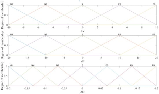 The FLC control structure is displayed in Figure 5, where its mechanism is composed of three functional blocks: a fuzzification, an inference engine and a defuzzification. The role of the first functional block is mapping the inputs ΔV and ΔP, which are defined in Equations (6) and (7), to fuzzy variables.