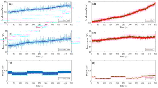 Weather conditions and duty cycle signals generated by IncCond and FLC tracking algorithms: (a) irradiation (W/m2) used for the experiment of the IncCond; (b) temperature (°C) used for the experiment of the IncCond; (c) duty cycle signal generated by IncCond; (d) irradiation (W/m2) used for the experiment of the FLC; (e) temperature (°C) used for the experiment of the FLC; and (f) duty cycle signal generated by FLC.