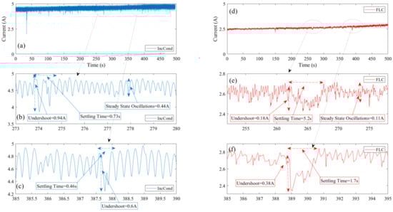 PV panel current signals correspond to the maximum power point: (a) current signal under the use of the IncCond; (b) influence of the first load variation for the case of the IncCond; (c) influence of the second load variation for the case of the IncCond; (d) current signal under the use of the FLC; (e) influence of the first load variation for the case of the FLC; and (f) influence of the second load variation for the case of the FLC.