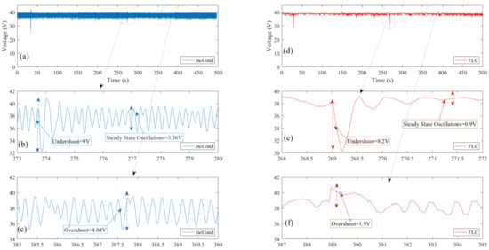 The voltage signals of the PV panel under the use of both tracking algorithms are presented in Figure 9. During the first load variation, undershoots of 9 V and 8.2 V occurred in IncCond and FLC, respectively, which means that the latter succeeded in reducing the undershoot by 0.8 V. During the second load variation, overshoots of 4.04 V and 1.9 V occurred in IncCond and FLC, respectively, which means that the FLC succeeded in reducing the overshoot by 2.14 V. Therefore, reductions of 8.9% and 52.9% were achieved via the use of the FLC tracking algorithm for the first and second load variations, respectively. Regarding the steady-state oscillations, the proposed FLC also succeeded in reducing the value from 3.36 V to 0.9 V, which represents a value of 73.2%.