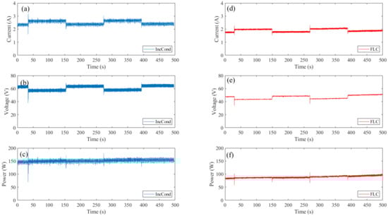 The output signals of the DC–DC boost converter under the application of the IncCond and FLC tracking algorithms are displayed in Figure 10. According to these graphs, it is clear that the proposed FLC tracking algorithm shows better performance in terms of robustness and steady-state oscillations, which will result in increasing tracking efficiency.