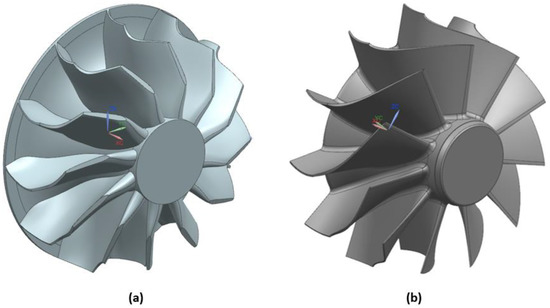 The geometries of (a) Rotor A—older version of turbine wheel and (b) Rotor B—latest version of turbine wheel (scaled to match the diameter of the Rotor A).