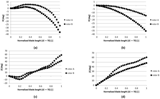 Angular comparison of rotors A and B: (a) theta angle at hub, (b) theta angle at shroud, (c) beta angle at hub and (d) beta angle at shroud.