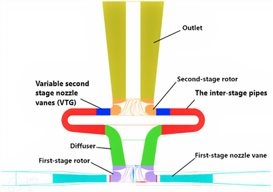 The numerical model consists of a uniquely-designed turbine inlet, the first-stage nozzle vane, a gap between the rotor and rotor hub, the first-stage rotor, the diffuser, the inter-stage pipes, the second-stage VTG vanes, the second-stage rotor, and the outlet. The cross-section of the model is shown in Figure 4 [27].