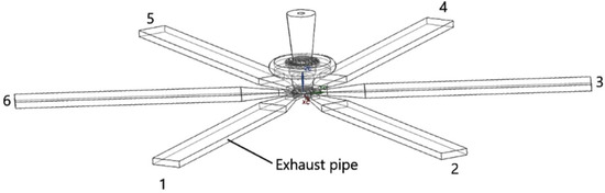 The configuration of the turbine inlet with the six exhaust pipes [27].