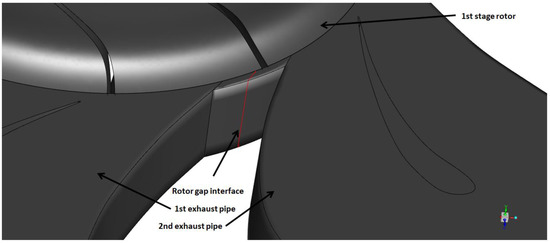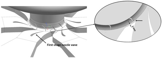 A rotor gap was modeled to simulate the gap between the tip of the first-stage rotor and the rotor hub. The gap height was set to 3 mm to capture the leakage between the adjacent exhaust pipes during the exhaust pulse. The captured losses allowed the authors to investigate the effectiveness of the designed inlet. The first-stage nozzle vane and the rotor gap are shown in Figure 6.