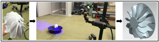 The first-stage rotor model was created using the AKON smartSCAN 3D HE scanner. A total of 60 scans were made during the one revolution of the turntable. Figure 7 shows the scanning process of rotor A [27].