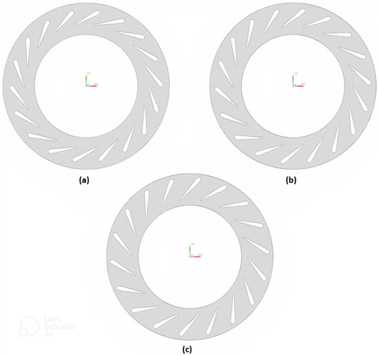 The second-stage VTG vanes guided the exhaust gases to the second-stage rotor. The simulation was carried out at three different VTG vane positions to optimize the numerical model. The nozzle vanes were set at the specified angles: 20°, 30°, and 40°, which indicated the closed, medium, and fully-opened positions of the VTG vanes. The domain of the VTG vanes can be seen in Figure 8.